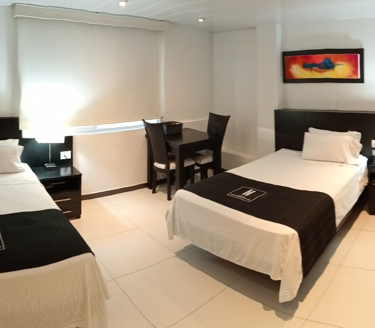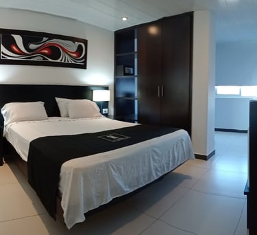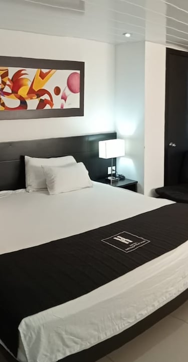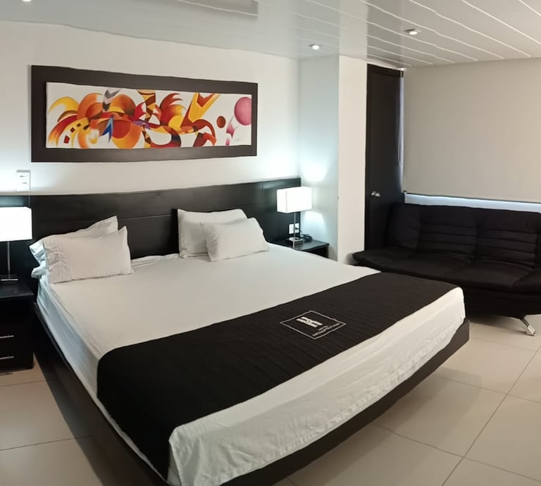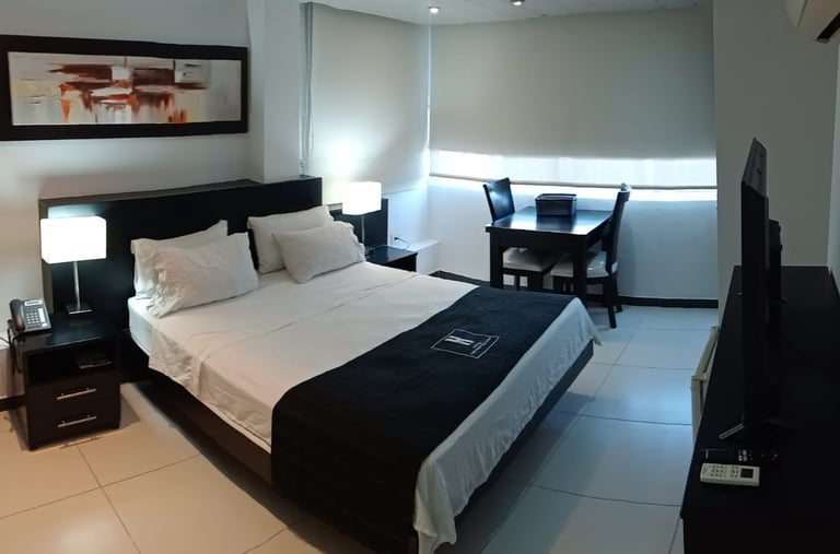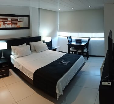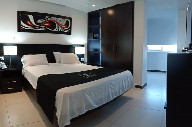 Amplia suite con escritorio, wifi rápido, minibar y baño privado, ideal para viajes de negocios que buscan comodidad y funcionalidad.